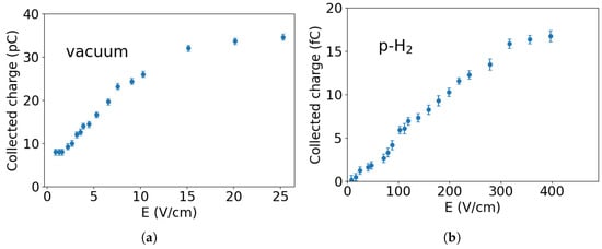 Electric field dependence of the collected charge in vacuum and in p-H2. (a) In vacuum, the collected charge reaches saturation at approximately E ≈ 25 V/cm. (b) In the p-H2 matrix (thickness ≈ 500 m), the amount of collected charge is significantly lower compared to the vacuum case, and saturation occurs at higher electric fields, greater than 400 V/cm. The decrease in electron penetration can be attributed to various factors, including quantum reflection and scattering processes within the p-H2 crystal.