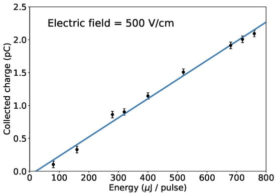 We performed several measurements at different laser pulse energies and observed that the amount of collected charge is, as expected, directly proportional to the energy of the laser pulses, as shown in Figure 5. The electric field dependence, instead, remained the same and always reached a saturation point for field strengths greater than 400 V/cm.