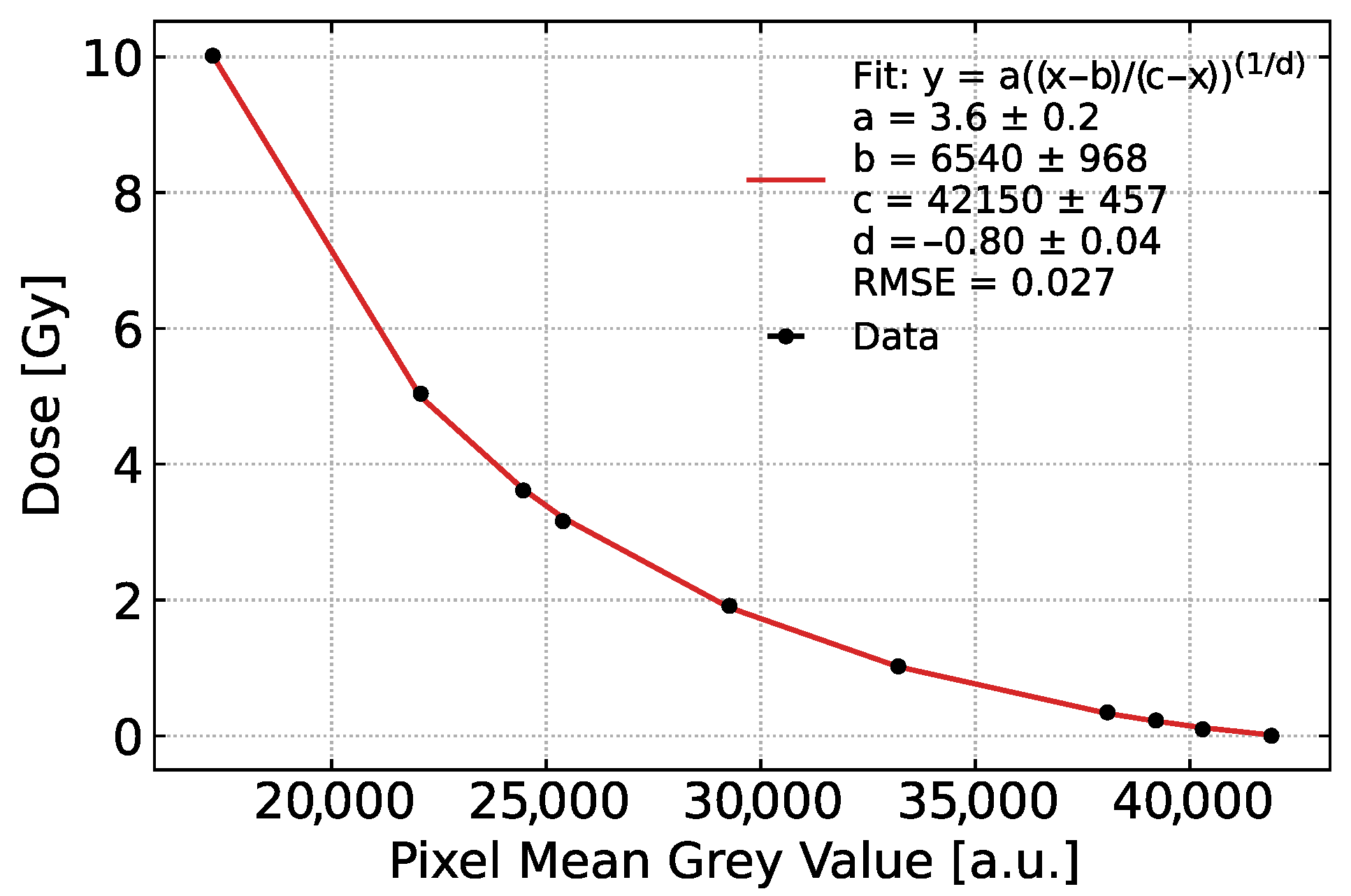 - Howard, M.E.; Herman, M.G.; Grams, M.P. Methodology for radiochromic film analysis using FilmQA Pro and ImageJ. PLoS ONE 2020, 15, 1–12. [Google Scholar] [CrossRef] [PubMed]