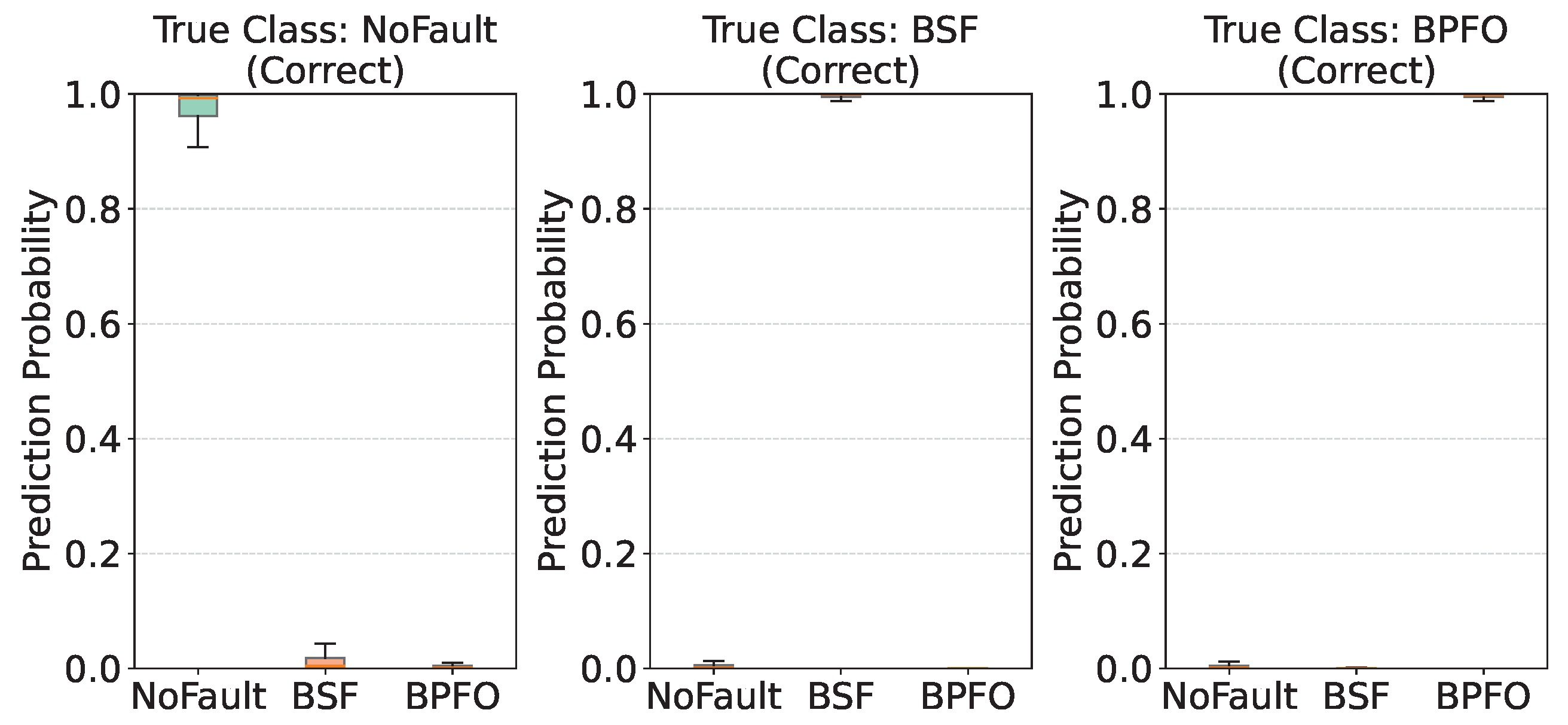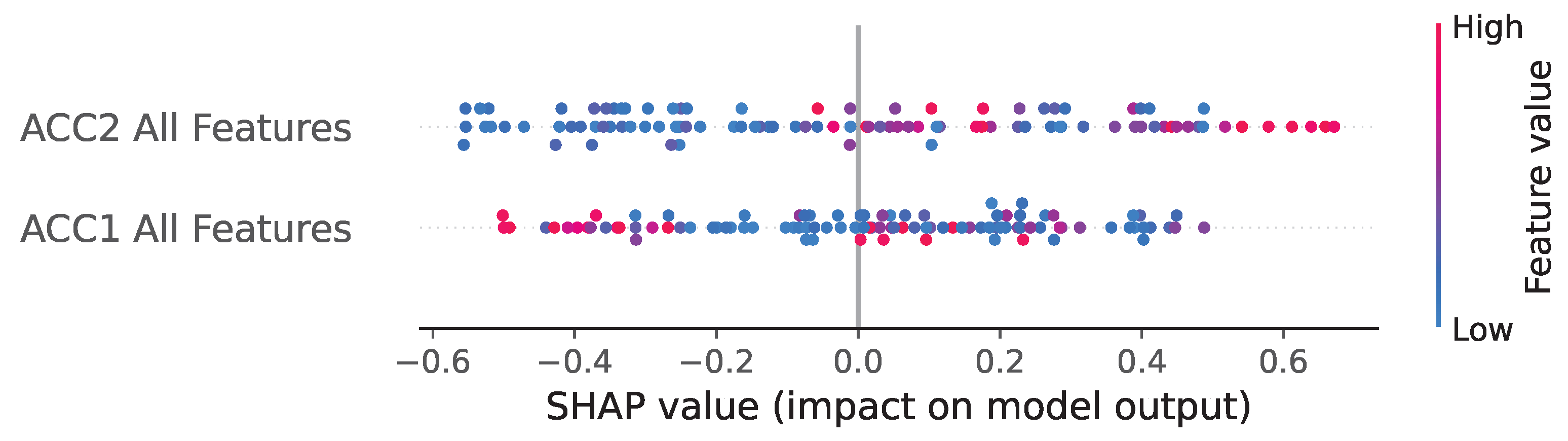 - Dominance of Frequency Features: the ACC1 Frequency Features and ACC2 Frequency Features groups exhibit the largest SHAP value magnitudes. This confirms that the spectral components, which directly correspond to the physical fault frequencies (BPFO and BSF), are the primary drivers of the model’s high diagnostic accuracy. The model correctly prioritizes these domain-expert-derived features to distinguish between different fault types.