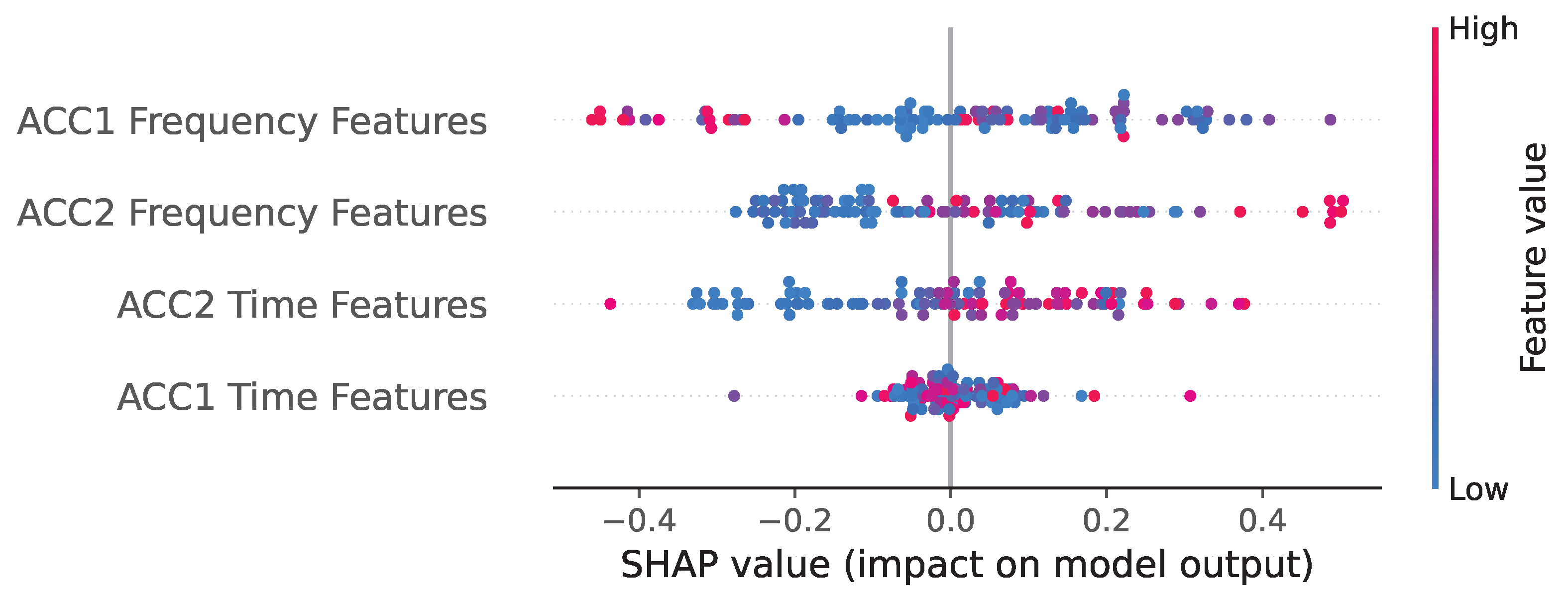 - Role of Time-Domain Features: while significant, the ACC1 Time Features and ACC2 Time Features groups show a comparatively lower overall impact. This indicates that traditional time-domain statistical descriptors, such as kurtosis, play a necessary but secondary role. They likely contribute to detecting the existence of an impulsive event (early-stage fault detection) and general severity (via RMS), but the frequency features are essential for accurate classification of the fault type.