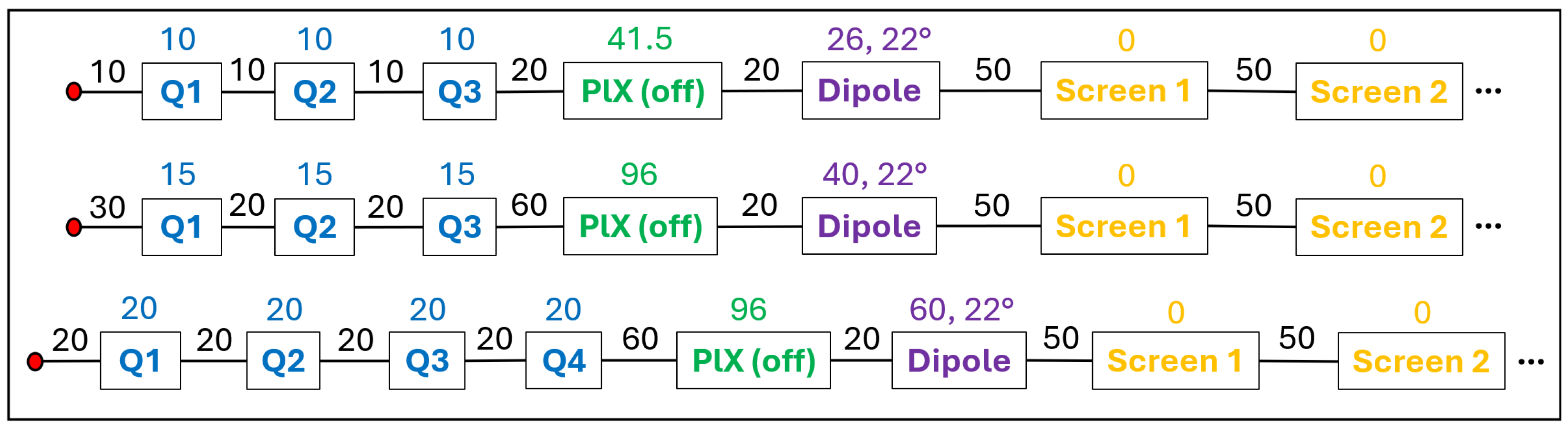 Figure 2. Lattice schemes assumed in the simulations at a design energy of 120 MeV (top), 400 MeV (middle), and 1 GeV (bottom). The numbers without units indicate lengths in centimeters. The red dots indicate where the simulations start. The quadrupoles are represented in blue. The PolariX RF transverse deflecting structures (green) are switched off during the beam energy measurements, so the tracked macroparticles see them as drifts. Design arc length and bending angle of each dipole are indicated in purple. In the simulation, the beam spot is analyzed at six evenly spaced positions (’screens’) after each dipole, starting from 50 cm from the dipole exit and ending at 3 m.