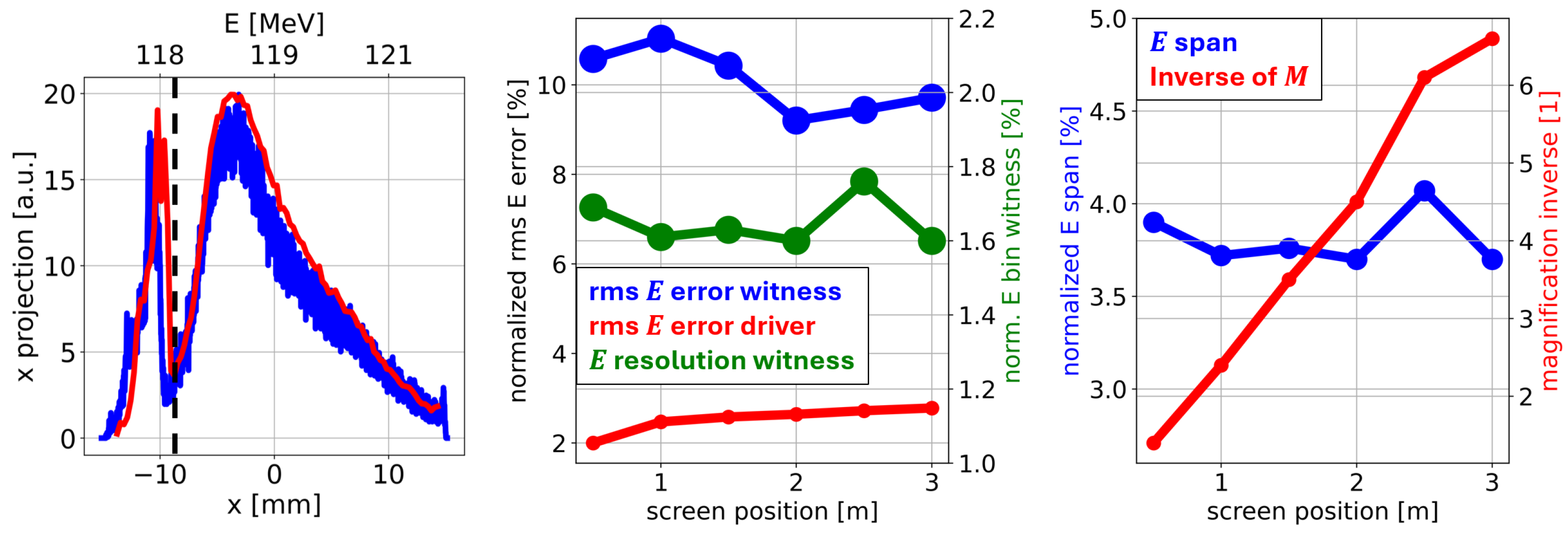 Figure 3 shows important outcomes coming from the simulations at 120 MeV. The witness and driver bunches can be distinguished on the screens, even if they are not entirely separated (Figure 3, left). Because the driver and witness are also separated before entering the dipole due to their difference in energy (118.2 MeV and 119.7 MeV), it is therefore possible for each of these bunches to compare the mean and rms energies at a certain screen position with the corresponding value of the initial bunch. The blue and red curves in Figure 3 (left) show that the shape of the initial beam energy profile is well retrieved with the measurement. Quantitatively, the normalized mean energy error is negligible (below 0.1%, not shown in Figure 3), independently of the position of the screen. The relative rms energy error depends significantly on the considered bunch, and it varies by a maximum of 2% along the screen position (Figure 3, middle). For instance, the screen placed at a 2 m distance leads to normalized rms energy errors of 9% and 3%, respectively, for the witness and driver bunches. It is important to note that these normalized rms errors are higher for the witness mostly due to its smaller initial rms energy spread (141 keV) compared to the driver one (776 keV), as the energy error without normalization is even lower for the witness (13 keV) than for the driver (21 keV).
