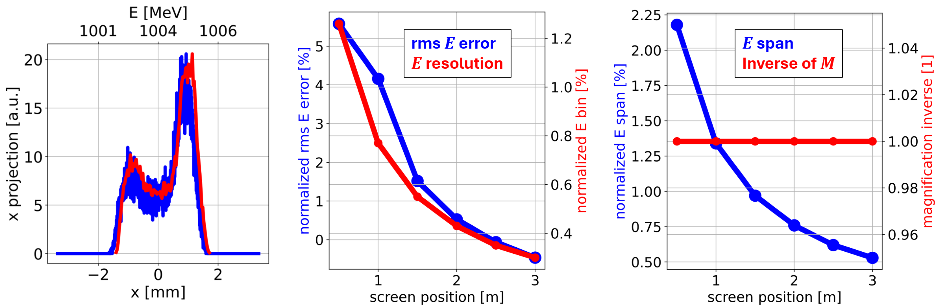 The fact that the energy resolution remains roughly constant when varying the screen position can be understood by examining the rightmost formula in Equation (1) and by observing that the energy bin size decreases if the dipole–screen distance increases, assuming a constant magnification. However, if the inverse of the magnification increases linearly as a function of the screen position, then the horizontal bin size also increases linearly, and this leads to a constant energy resolution, as well as to a constant energy span of 4% (Figure 3, right).