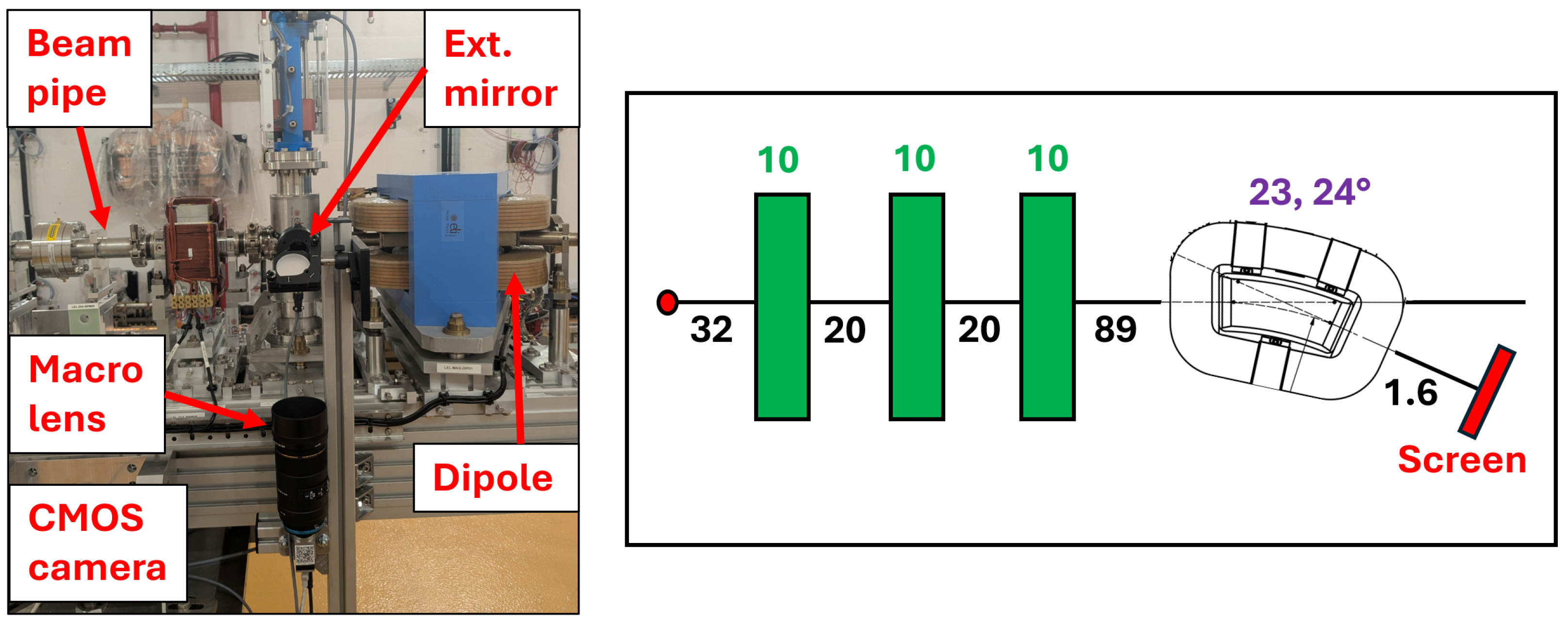 Figure 6. Left: Photo showing the dipole magnet used as a spectrometer at SSRIP. A diagnostic station that measures the transverse spot of the beam and which is located just before the dipole is also shown. Another diagnostic station with the same types of components (CMOS camera, viewing screen, etc.) has been installed after the dipole for beam energy measurements. Right: Accelerator layout considered in the simulations. The numbers without units indicate lengths in centimeters. The three quadrupoles used to minimize the beta function at the screen position are schematically represented with green rectangles. The length of the design arc of the sector dipole and the nominal bending angle are indicated in purple. Simulations start in correspondence with the red dot, which is 11 m away from the cathode of the RF gun, and terminate at the viewing screen, which is placed at 1.6 m from the dipole exit.