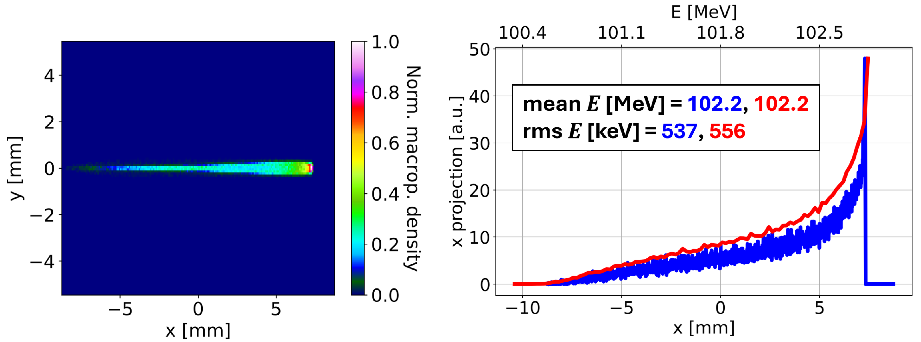 Figure 7. Left: FOV at the screen position, assuming a magnification inverse of 2.6. The FOV contains the simulated transverse beam spot. Right: Projection (blue) on the horizontal axis of the FOV shown in the left plot. The energy axis is obtained from the horizontal one by using the leftmost formula in Equation (1). The energy profile of the initial bunch distribution is displayed in red. The mean and rms energies of the two shown profiles are reported in the box using corresponding colors.