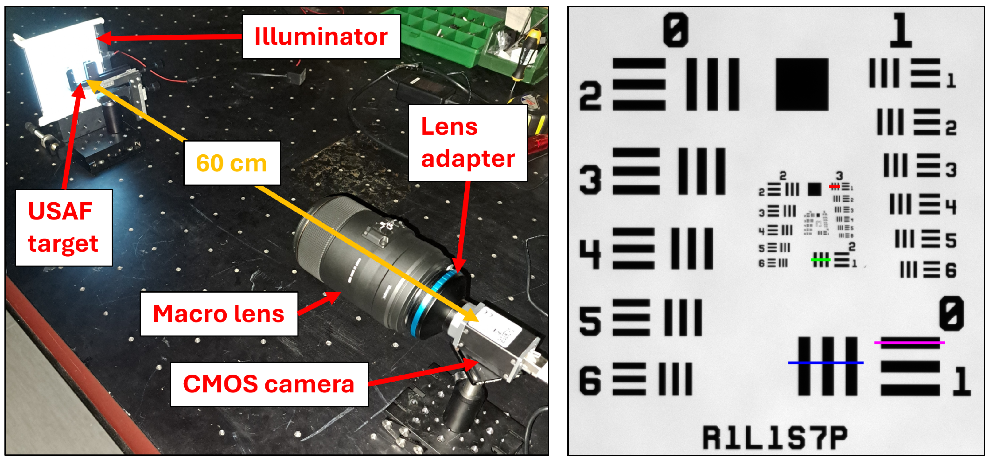 Figure 8. Left: Laboratory setup used for the optics measurements. The distance between the camera sensor and the USAF target is 60 cm. The square illuminator behind the target is the only source of light during the measurements. Right: Zoom on an acquired image, with a distance between the sensor and the target of 70 cm. The four line segments displayed with various colors belong to different groups or elements of the USAF target, and they indicate where the corresponding pixel profiling shown in Figure 9 is performed. The blue, green, and red segments are related to the determination of the resolution of the optics system, whereas the magenta segment is used for the evaluation of the magnification.