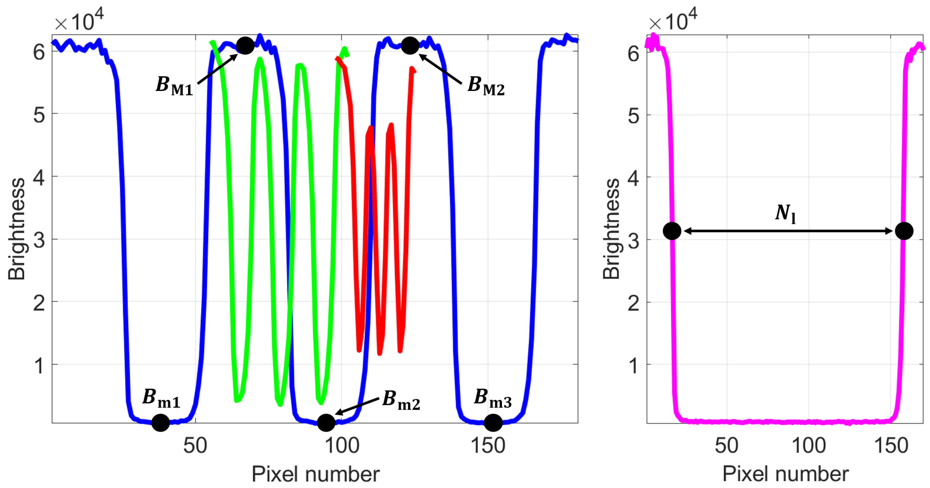 Figure 9. Left: Pixel profiling related to the blue, green, and red line segments shown in Figure 8 (right). The design resolutions corresponding to these segments are 500 µm, 125 µm, and 62 µm, respectively. The reference pixel with number zero corresponds to the one where the blue line segment starts. A 12-bit brightness value (from 0 to 4095) is associated with each pixel. Due to the 8-bit alignment performed by the camera software and the consequent zero padding affecting the transmitted image data, each 12-bit brightness value is converted to a 16-bit one (from 0 to 65,520) through a multiplication by 16. The black dots denote three minimum and two maximum points of the blue brightness curve, and they are used to compute the averaged Michelson contrast. Right: Pixel profiling related to the magenta line segment shown in Figure 8 (right). The number of pixels covered by the black line segment is denoted by N l . The pixel zero corresponds to where the magenta segment starts.