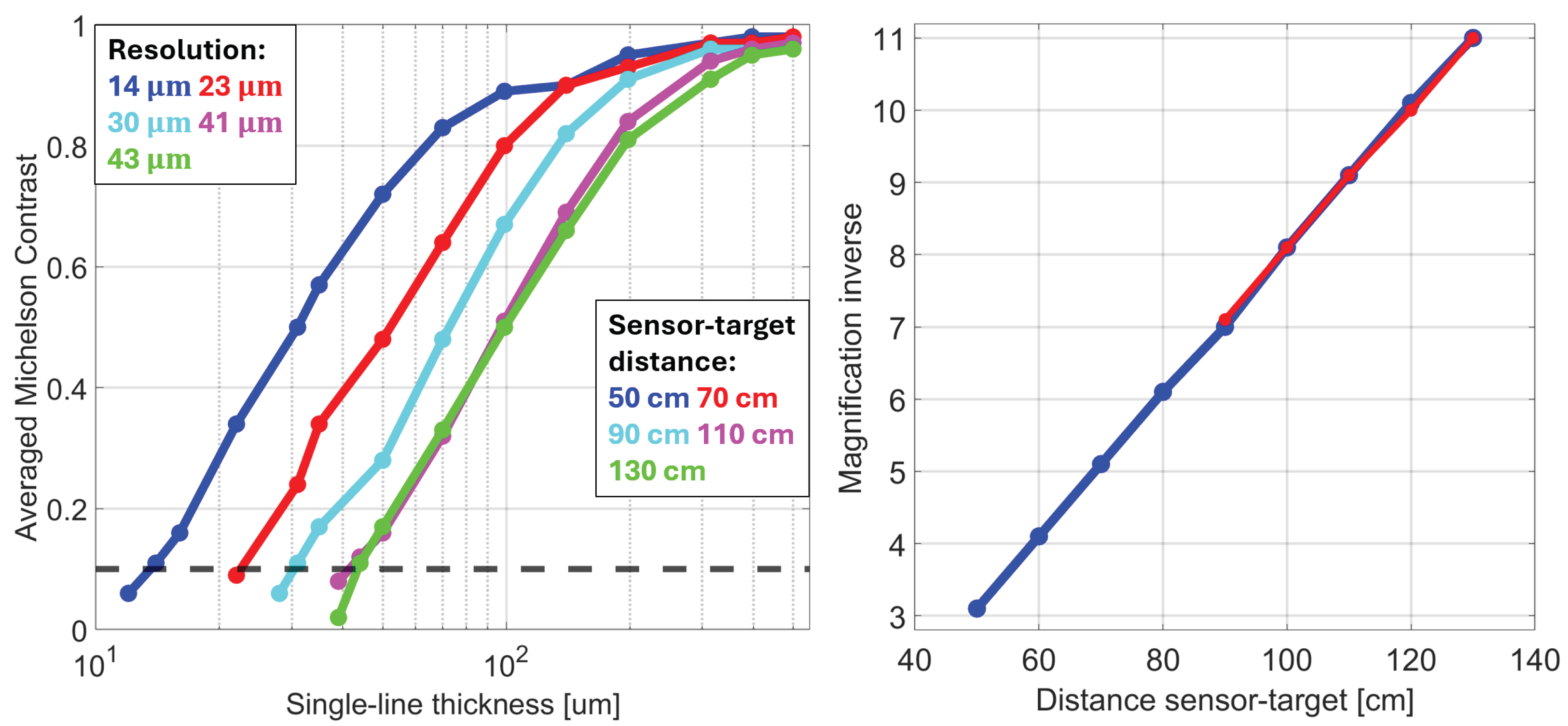 Figure 10. Left: Averaged Michelson contrast as a function of the USAF single-line thickness (or design resolution). Each color represents a different distance (bottom right box) between the camera sensor and the USAF target. The resolution values corresponding to a contrast of 0.1 (dashed line) have been obtained by interpolating the displayed data points, and they are reported in the top left box. Right: Inverse of the magnification as a function of the sensor–target distance. The reference segment chosen for the magnification evaluation is either a USAF line segment belonging to the element 1 of group 0 (blue curve) or one side of the USAF target (red curve).