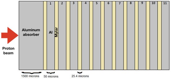 The multi-leaf Faraday cup we designed and constructed allows assessing the proton beam energy distribution by measuring the current collected by successive foils. The resolution of the measurement depends on the thickness of the absorber material and of the aluminum foils. The thickness and number of layers were chosen according to the outcome of a simulation performed with the SRIM [] software, with which the transport of ions in matter can be accurately calculated. A previous measurement of the beam energy and energy spread of the Bern medical cyclotron [] was used as input to the simulation to calculate the proton range within the multi-leaf Faraday cup. On the basis of simulations and material availability, 50 m 10%-thick aluminum sheets and 25.4 m ± 10%-thick Mylar polyester foils were chosen. Following the SRIM calculations, the protons in the range of 16.5–20.5 MeV were able to be measured by interleaving 11 aluminum foils with 11 Mylar sheets and preceding such a stack by a 1.5 mm-thick aluminum absorber, as shown in Figure 1.