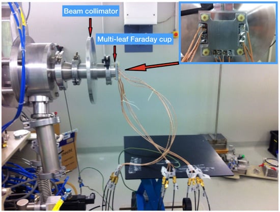The multi-leaf Faraday cup installed on the Beam Transport Line (BTL) of the Bern cyclotron. A close-up is shown in the inset.