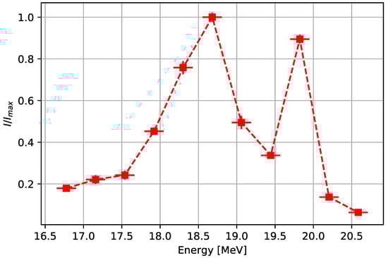 The first series of measurements was performed for the optimal isochronism condition. The ion source arc current was always set to a value corresponding to induced currents in the nA range in all the channels of the multi-leaf Faraday cup. In this current range, the electrometer shows the most stable readings. The measured beam energy distribution in the condition of the optimal isochronism is shown in Figure 3. The probability density is expressed in units of normalized induced current , where corresponds to the channel with the highest measured current. The distribution presents one peak at a beam energy of MeV. The measurement was repeated for two slightly different currents set in the main coil of the cyclotron, but remaining in the vicinity of the optimal isochronism. A good agreement was found, and the peak was localized at the same beam energy value within the uncertainty. In order to compare the obtained results with the measurement performed with a different method and reported in [], the mean energy and RMS of the distribution were also evaluated and found to be MeV and MeV, respectively. The values reported in [] were MeV and MeV for the beam energy and RMS, respectively. The beam energy values are therefore in agreement within 1 and the RMS values within 1.8. The peak energy of MeV, found in [], is in a good agreement with the results presented in this paper. It has to be noted that the two compared methods are characterized by a different resolution and were performed in slightly different conditions. The region of the optimal isochronism, corresponding to our definition based on a maximum beam transmission, spans a certain range of main coil settings, and the resulting energy distributions can vary to some extent. Another possible reason for the observed difference is the fact that the method reported in [] gives the probabilities of finding beam energy within histogram bins, while the measurements described in this paper characterize the distribution by the evaluation of discrete points. Furthermore, the main coil of the cyclotron warms up during operation, making the operation conditions slightly different.