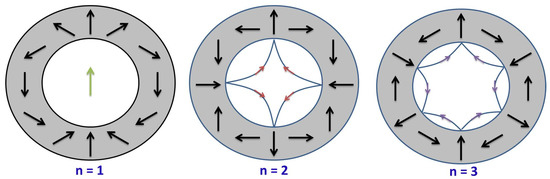 A Halbach structure is an array of magnets with specific arrangements generating a concentrated strong magnetic field on one side whilst creating a weak stray field on the opposite side [37]. Different multipole systems can be build using such structure as displayed in Figure 2 where 12 segmented magnets are used to design a dipole, quadrupole and a sextupole.