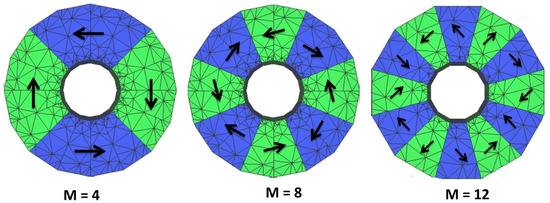 Figure 3 shows the Halbach rings for different number of segments designed by Radia. The magnetization vectors of the magnets depends on the number of segments of the Halbach structure: = ()6*/M, where i is an integer, for example the angle between the magnetization vectors of two consecutive magnets is 270° for M = 4, 135° for M = 8 and 90° for M = 12 etc.…