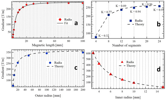 Figure 4a presents the computed gradient versus magnetic length where Equation (4) is valid for large values ~50 mm. The gradient is computed for different numbers of segments and are compared to Equation (4) (see Figure 4b), where the gradient increases for higher numbers of segments. Figure 4c,d presents the computed gradient for different , and shows good agreement with Equation (4).