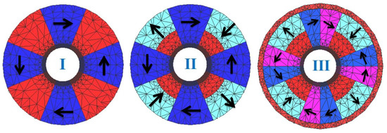 Halbach quadrupole with different number of sections with their corresponding magnetization vectors.