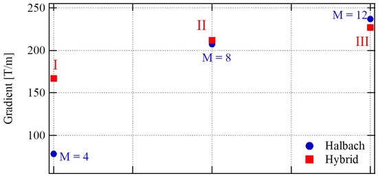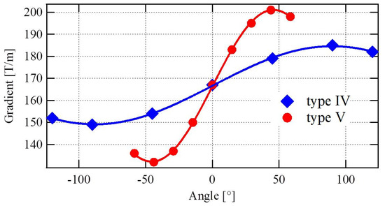 Figure 8 presents the gradient tunability as a function of the angle. Type IV design achieves a maximum gradient of 201 T/m and tunability of ~70 T/m by rotating the outer ring from −45° to 45°. Type V design provides a maximum gradient of 185 T/m and tunability of 35 T/m by rotating the cylindrical magnets from −90° to 90°. Type VI is composed of magnetic rods and by displacing them the gradient is varied from a maximum value of 100 T/m down to very low values depending how far the rods can be placed away from the center.