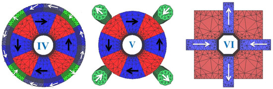 Different Halbach hybrid designs. (Red) poles, (blue, green) magnets with the reference parameters of Table 1. (IV): Outer ring placed 2 mm away from the inner ring with a thickness of 2 mm. (V): The cylindrical magnets of radius 2 mm placed at 2 mm from the inner ring. (VI): Magnetic rods of thickness 5 mm and length of 14 mm.