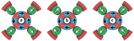 Figure 14. Scheme of the QUAPEVA: Permanent magnet blocks (Blue) and rotating cylinders (Red), Vanadium Premendur magnetic plates (Green) and poles (Orange), Aluminum support frame (Grey). (a) maximum, (b) intermediate, and (c) minimum gradient.
