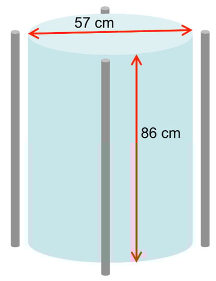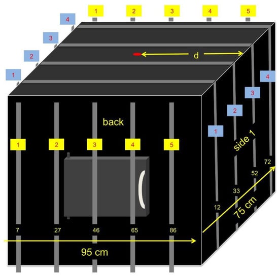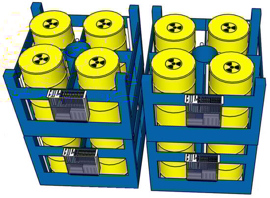 The low and intermediate level radwaste storage sites can have many different configurations, ranging from a rather haphazard drum storage to a very regular geometrical placement onto piles of dedicated platforms. One of the main issues is also the high cost of the storage space, and this is why a solution for the radioactivity monitoring has to be as modular as possible and based on simple, compact, scalable, and robust detectors. A typical arrangement scheme we proposed in [,,,], responding to these requirements, is sketched in Figure 1.