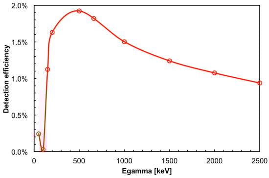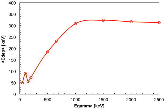 The operating principle is the following: whenever a gamma-ray interacts with the fiber it deposits a variable amount of kinetic energy which gives rise to a short flash of scintillation light. Apart from very low energy cases where the photoelectric effect could take place, the interaction occurs mainly through Compton effect and the energy is deposited by the scattered electron through a complex pattern of many electron–electron collisions. A fraction of the scintillation photons is trapped into the fiber and propagates toward both ends. If the number of these photons is large enough to produce a signal above a predefined threshold simultaneously on both fiber ends, such a coincidence event is considered as the detection of a gamma-ray and can be counted. By using the GEANT4 code [] we simulated the interaction of gamma-rays of a few selected energies with a fiber of 3 mm diameter, recording the energy deposited on the fiber event by event whenever the deposition was at least 50 keV. Indeed, below 50 keV the average number of photons detected on the SiPM would be <4, as will be explained in Section 2.2 and Section 2.3. Then, for each impinging gamma-energy we calculated the average deposited energy and the results are plotted in Figure 2. The plateau in the curve is due to scattered electrons escaping the fiber. The same simulation allowed us to calculate the expected intrinsic detection efficiency as the ratio between the reported counts and the number of impinging gamma-rays. The results are shown in Figure 3.