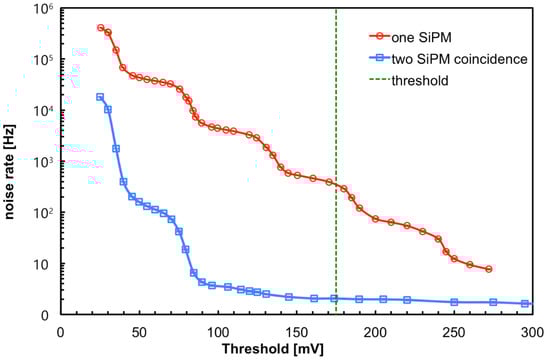 In order to choose an appropriate threshold level for the SiPM we studied the noise counting rate as a function of the threshold, and the resulting typical staircase plot is reported in Figure 4. Each step corresponds to one detected photon, and we decided to use a threshold at 175 mV that corresponds to ≈3.5 photons and reduces the noise rate by three orders of magnitude down to about 350 counts per second. As the signals have a duration of about 30 ns, a duration of 100 ns for the coincidence window between the two SiPMs makes the probability of spurious coincidences negligible.