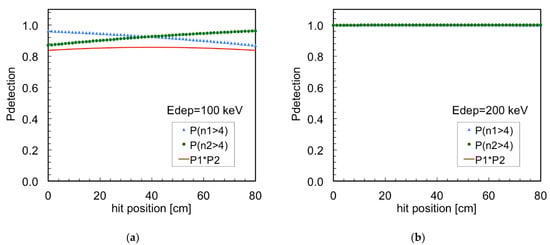 Detection efficiency of a gamma-ray as a function of the impact position on an 80 cm long fiber, calculated as the product of the probabilities of getting at least four photons detected on each SiPM. (a) When the gamma-ray deposits 100 keV. (b) When the gamma-ray deposits 200 keV.
