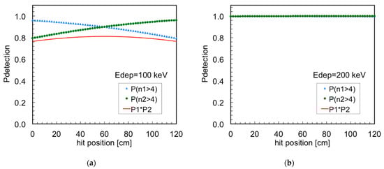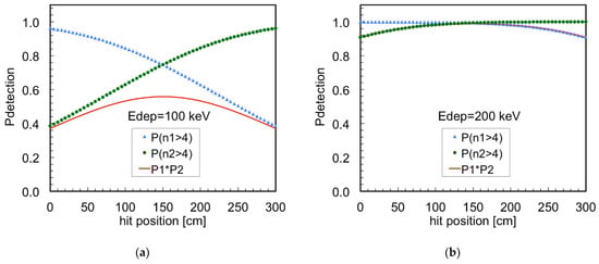 Detection efficiency of a gamma-ray as a function of the impact position on a 300 cm long fiber, calculated as the product of the probabilities of getting at least four photons detected on each SiPM. (a) When the gamma-ray deposits 100 keV. (b) When the gamma-ray deposits 200 keV.