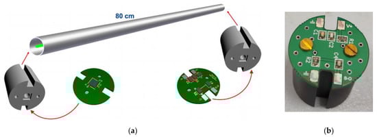 We opted for the 80 cm length, even in light of the height of the standard 120 and 210 L radwaste drums (76 and 88 cm). The scintillating fiber was allocated inside a 2 cm diameter and 1 mm thick aluminum pipe, and held in place by two cylindrical holders designed to host a circular PCB with the SiPM and its support circuitry. The holder has a central hole to allow for fiber-to-SiPM alignment and optical coupling by means of a tiny grease drop, and two side grooves to allow for the passage of cables (for this phase we chose the grease for reversibility, an optical glue will be the final solution). Two light-tight rubber caps complete the setup, with three cables coming out of one single side for the common voltage bias and the two output signals. A sketch and three pictures of the SciFi detector components are shown in Figure 8. We remark that the attenuation of gamma-rays when crossing the aluminum pipe is a few percent at very low energy and goes down to about 1–2% at higher energy (Figure 9) [].