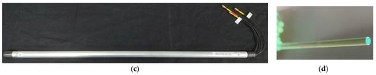 The chosen scintillating fiber, whose main characteristics are listed in Table 1, is the BCF-20 produced by Saint Gobain (Nemours, France) []. We preliminarily tested both 1 mm and 3 mm diameter fibers and chose the latter, which has a higher detection efficiency as the average energy deposited by the detected gamma-rays is larger. Moreover, even though the 3 mm fiber is stiffer than the 1 mm one, it is still flexible enough for a possible future solution in a curved or round shape.