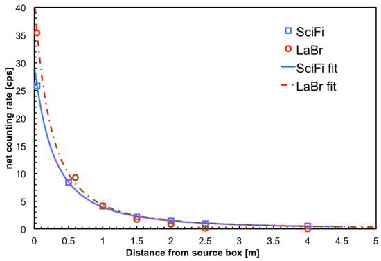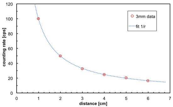 which is what we obtained and corresponds to an equivalent dose of about 118 µSv/h []. A 1/r fit perfectly reproduces the measured count rates, as shown in Figure 11.