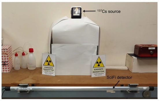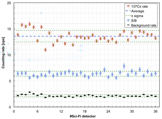 For a better check of the simulation results, and in order to verify the uniformity of the response within the set of SciFi detectors, we assembled a simple setup with a point-like 137Cs gamma source, with activity A = 1.49 ± 0.07 Mbq, and a detector holder that kept the mid-point of the fiber at a distance d = 52 cm from the source (Figure 12). The counting rate of each detector was measured in 200 s, as well as the background rate and the signal-to-background ratio, and the results are plotted in Figure 13. The non-uniformity of the response is due to tiny differences between the individual SiPMs, which are amplified by their exponential multiplication mechanism, and slight imperfections of the optical coupling. However, the non-uniformity is quite limited and reasonable. Notice that the background count level is the same as shown by the blue line in Figure 4, as it represents the physical background due to cosmic rays and natural radioactivity.