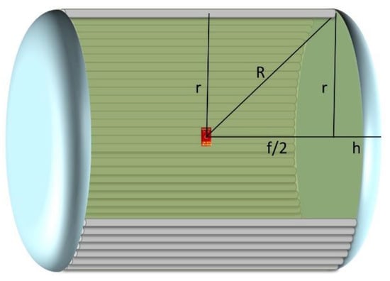 The net measured counting rates, i.e., after subtracting the background, were used to calculate the detection efficiency with gamma-rays of 662 keV energy. The geometrical efficiency ε in this configuration can be calculated starting from a barrel-like solid angle covering (Figure 14), subtracting the fraction covered by the two spherical caps, and then dividing by the number of fibers that would cover the entire cylinder. The relevant quantities are r = 52 ± 0.5 cm, fiber length f = 80 ± 0.05 cm, fiber diameter c = 0.3 ± 0.003 cm, R = 65.6 ± 0.4 cm, h = 25.6 ± 0.4.