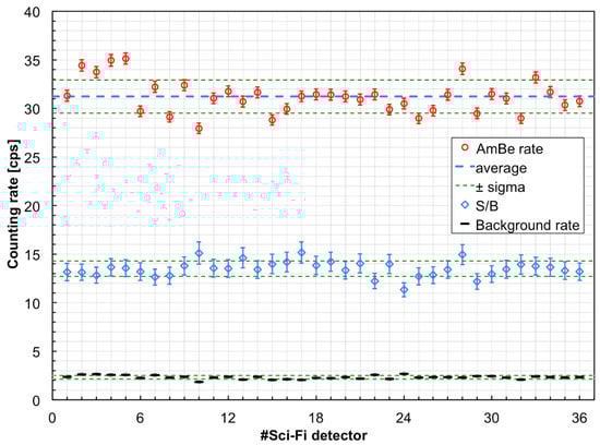 The counting rate of the 36 SciFi detectors, measured on top of the AmBe source in 100 s, along with the background rate and the signal-to-background ratio. The error bars represent the statistical uncertainty, the green dashed lines indicate ±1 standard deviations from the average.