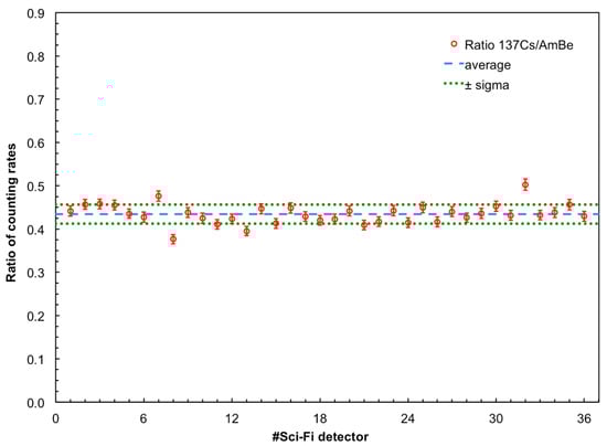 All the SciFi detectors were tested on top of the source box, and the measured counting rate, the background and the signal-to-background ratio are reported in Figure 17. For each detector we calculated the ratio between the observed counting rates respectively with the 137Cs and the AmBe sources. The results, plotted in Figure 18, indicate a quite reasonably constant behavior of this ratio.