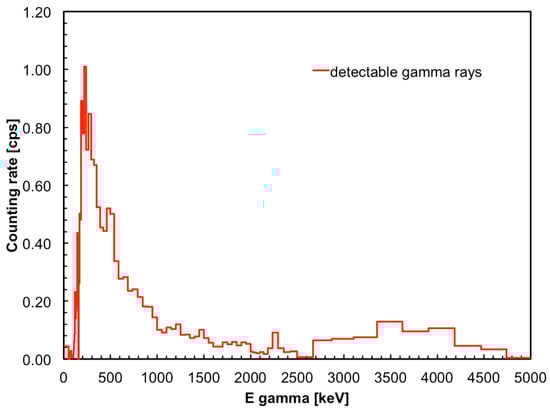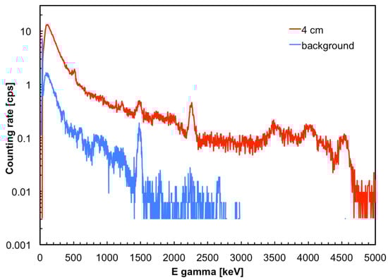 The spectrum of the gamma-rays exiting the source box was measured at several distances by means of a cylindrical lanthanum bromide scintillator (LaBr3, in short LaBr), 3.8 cm diameter and 5 cm length, placed at mid-height with respect to the box. LaBr naturally contains about 0.09% of the 138La isotope, which is unstable and emits gamma-rays at 1435 keV, and also impurities of alpha emitters which produce counts around 2–3 MeV equivalent energy. The spectrum measured at 4 cm distance from the box wall is plotted in Figure 19, along with the environment background measured far from the source. For all the following evaluations the background spectrum was subtracted from the measurements.