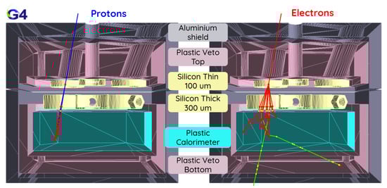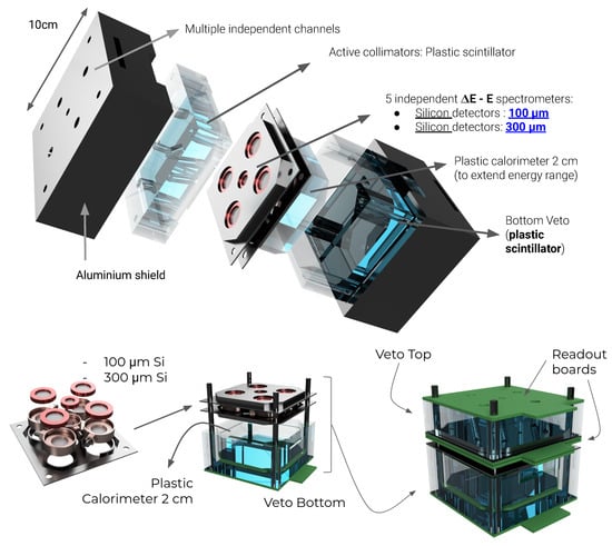 In Figure 2, a representation of the detector shows the components and its preliminary assembly. On the other hand, in Figure 3, a schematic view of the instruments explains its adopted detection scheme. A particle, when approaching the detector, can enter the instrument through the holes in the top aluminum structure, preventing the detection by the perforated top ACD (made of plastic scintillator). Depending on the particle’s direction, charge and kinetic energy are determined by one of the five ΔE-E spectrometers. Each spectrometer consists of a thinner silicon detector (100 μm thick) placed on top of a thicker silicon detector (300 μm thick).