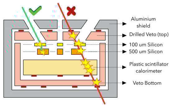 Schematics of the LEM detection approach; the green track is an example of good events (fully confined), and the red track represents an event to be rejected (not fully confined). The yellow star markers represent the energy deposited by the charged particle into the sensitive elements of the detector. Good events are characterized by a partial energy deposit in the thinner SD (100 μm) and a complete energy release in the thicker SD (300 μm) or, eventually, in the plastic calorimeter. In the second case, since the energy resolution of the plastic scintillator is worse, energy measurement will be affected by a larger uncertainty. Nevertheless, only when the energy release caused by the particle is confined within the detector an accurate PID is possible. Events to be rejected are characterized by an energy release in at least one of the two ACDs, or in more than two SDs not aligned on the same axis (e.g., two SDs that belong to different independent channels). Nonetheless, MIP particles (e.g., atmospheric muons on the ground), corresponding to crossing particles, will be used for calibration purposes.