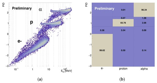 To estimate the particle identification efficiency, it is possible to define some specific intervals for the PID for each particle: (−3, 0) for electrons, (0.7, 1.4) for protons, and (1.6, 2.5) for alpha particles. In the table shown in Figure 5b, the particle identification tagging efficiencies, for the three families of particles, are higher than 90% in the three respective PID proxy intervals. In particular, we observed that more than of particles, for each of the three generated classes (electrons, protons, and alpha), were correctly tagged.