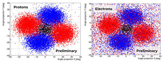 Angular resolution and Field Of View (FOV) of the LEM for protons on the left and electrons on the right. The different colors encode the pair in the ΔE-E spectrometer that is triggered. Since the detector exhibits axial symmetry, different colors are used to distinguish between adjacent lateral channels (in blue or red) and the central channel (in black). It is possible to see, on the right panel, the important effect of the electron’s multiple scattering. Some electrons hitting the aluminum shield are then scattered in the direction encoded by one of the five channels.