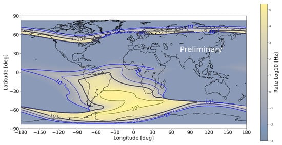 Figure 8 shows that the LEM will encounter a significant acquisition rate (≈50 kHz) in the South Atlantic Anomaly (SAA). Therefore, a dual data transmission strategy is being developed. An “event-based” approach will be adopted for rates below 1 kHz. On the other hand, a “histogram-based” approach will be adopted for higher rates. This will ensure proper usage of the assigned data bandwidth to the LEM.