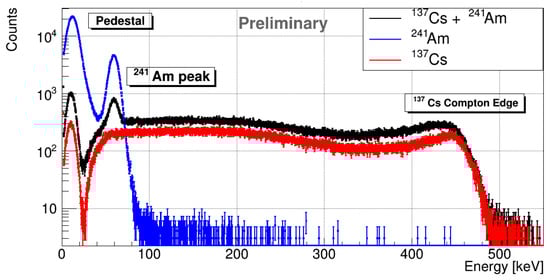 Some preliminary measurements were performed using the DAQ manufactured by Nuclear Instruments SRL. For these measurements, a fully depleted silicon detector with an embedded CSA was used (AP-CAM25 manufactured by MIRION). The spectra were acquired by exposing the detector to different radioactive sources. As indicated in the legend, the red curve represents the Compton edge of the 662 keV gamma-ray from the decay of Cs. The blue spectrum displays the peak at 59.5 keV from the decay of the Am radioactive source. The black spectrum was obtained by exposing the silicon detector to both radioactive sources, Am and Cs.