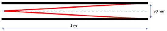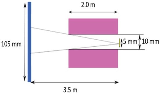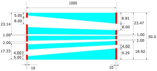 The design parameters of this multi-channel collimator guide system are presented in Figure 4. The materials chosen are boron nitride (red, Figure 4) and aluminum (blue, Figure 4). The collimator consists (i.e., the design, since it has not been constructed yet) of four channels with different widths and an overall height of 50 mm of boron nitride diaphragms and an aluminum support.