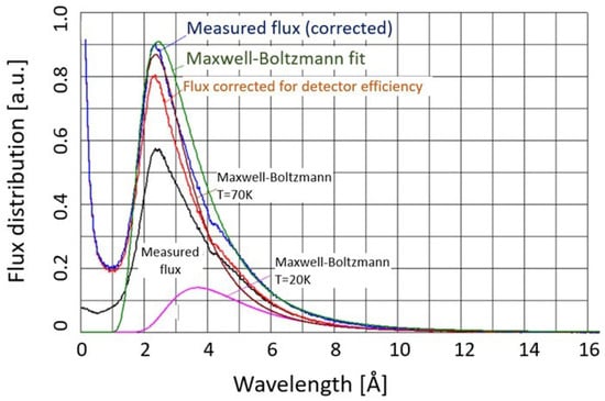 The effective wavelength of the beam was calculated using the TOF wavelength distribution shown in Figure 3. The results led to n/cm2/s and an isotropic neutron flux of n/s/cm2/sr. The measured wavelength distribution was fitted with two Maxwell–Boltzmann distributions (Figure 3) with characteristic temperatures of 20 K and 70 K and an intensity ratio of 20:80, respectively. The peak flux is centered around 2.3 Å.