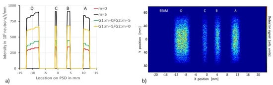 Figure 5a shows the calculated 1D neutron intensities along the detector for the different collimator channels.The distance between the sample and the surface of the detector was set to 2.4 m, and the width of S2 was set to 0.1 mm to act as a pinhole. The CNS was represented as a homogeneous circular surface. The results show that the intensity in all the channels is similar, with reduced intensity towards the edges due to the circular shape of the source and the rectangular shape of the channels; part of the channel looks around the edges of the source. The effect is estimated to be approximately 10%. The four different lines in Figure 5a show the influence of the coatings on the reflecting surfaces. The coating of the guide containing the FOM only marginally contributes to the intensity on the detector, while the coating on the multi-channel collimator guide gives a yield of approximately 30%.