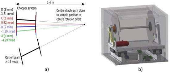 To support the alignment of the chopper axis with respect to the neutron beam axis, the height of the chopper system is made adjustable (maximum +/−20 mm) to enable positioning of the chopper opening at the height of the beam. The chopper system enables rotation of the chopper axis by +/−10 mrad in the horizontal plane around the sample location at 1.4 m from the first disk (upstream) of the chopper (Figure 7a). The accuracy corresponds to the chopper axis alignment accuracy.