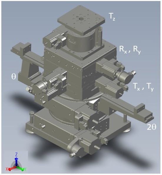Seven-axis sample stack consisting of () goniometer; X,Y translation; X,Y rotation/tilt and Z-stage (from bottom to top).