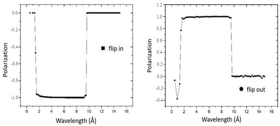 A radio-frequency spin flipper was selected because of the wavelength range needed and the limited space available. For such flippers, it is best not to have wires in the beam. Note that these flippers use a gradient field and, hence, can also work for a white beam. The beam length needed for such spin flippers is approximately 0.2 m. The distance between the polarizer and the spin flipper depends on the fall-off of the guide field to the polarizer. This can be slightly manipulated by design. Here, values for a typical polarizer were used, i.e., about 0.2 m. Monte Carlo simulations using the VITESS (Virtual Instrumentation Tool for the ESS (VITESS) version 3.4, Helmholtz-Zentrum Berlin für Materialien und Energie (HZB), Berlin, DE and Forschungszentrum Jülich, Jülich, DE) software package polarization modules [19] with a standard polarization configuration are presented in Figure 9. The modules used in the simulations were and (before and after the sample position).