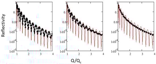 Reflectivity curves for 2.5%, 5.0% and 10% Q-resolution (from left to right). Red: theoretical curve without resolution contribution. Black: theoretical curve folded with a Gaussian distribution function with an FWHM equal to the Q-resolution. Reflection angle 20 mrad. Horizontal axis: .