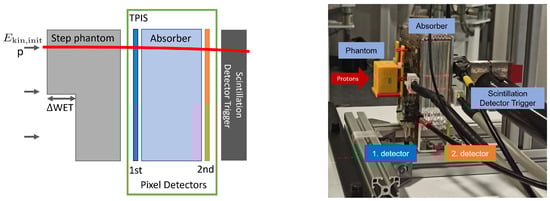 The photo in the right panel of Figure 1 shows the TPIS prototype used for the proof-of-principle measurement. The first detector uses a 100 μm-thick silicon sensor and the second detector a 50 μm-thick silicon sensor to keep the deposited charge below the upper limit of processable charges of 100 ke of the ATLAS IBL readout chip []. The depletion voltages of the 100 μm- and 50 μm-thick sensors were measured to be 10 and 2 , respectively. The sensors are operated in over-depletion at bias voltages of 35 and 30 . The PMMA absorber between both detectors has a total thickness of . Absorber thickness and an initial kinetic energy of 103 are set to minimize the dose in the phantom while maximizing the WET resolution for the investigated WET range between 10 and 40 . The output of a scintillator detector mounted downstream of the TPIS is gated with a 4 signal using a trigger logic unit (TLU). Using this signal to trigger data readout, the system can be operated at clinical beam intensity.